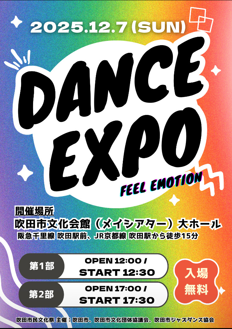 吹田市千里丘市民センターホール 17:00〜お食事をしながら参加型ダンス、先生方のコラボダンス、ファッションショー、くじ引きなど盛りだくさんでお楽しみ頂けます。