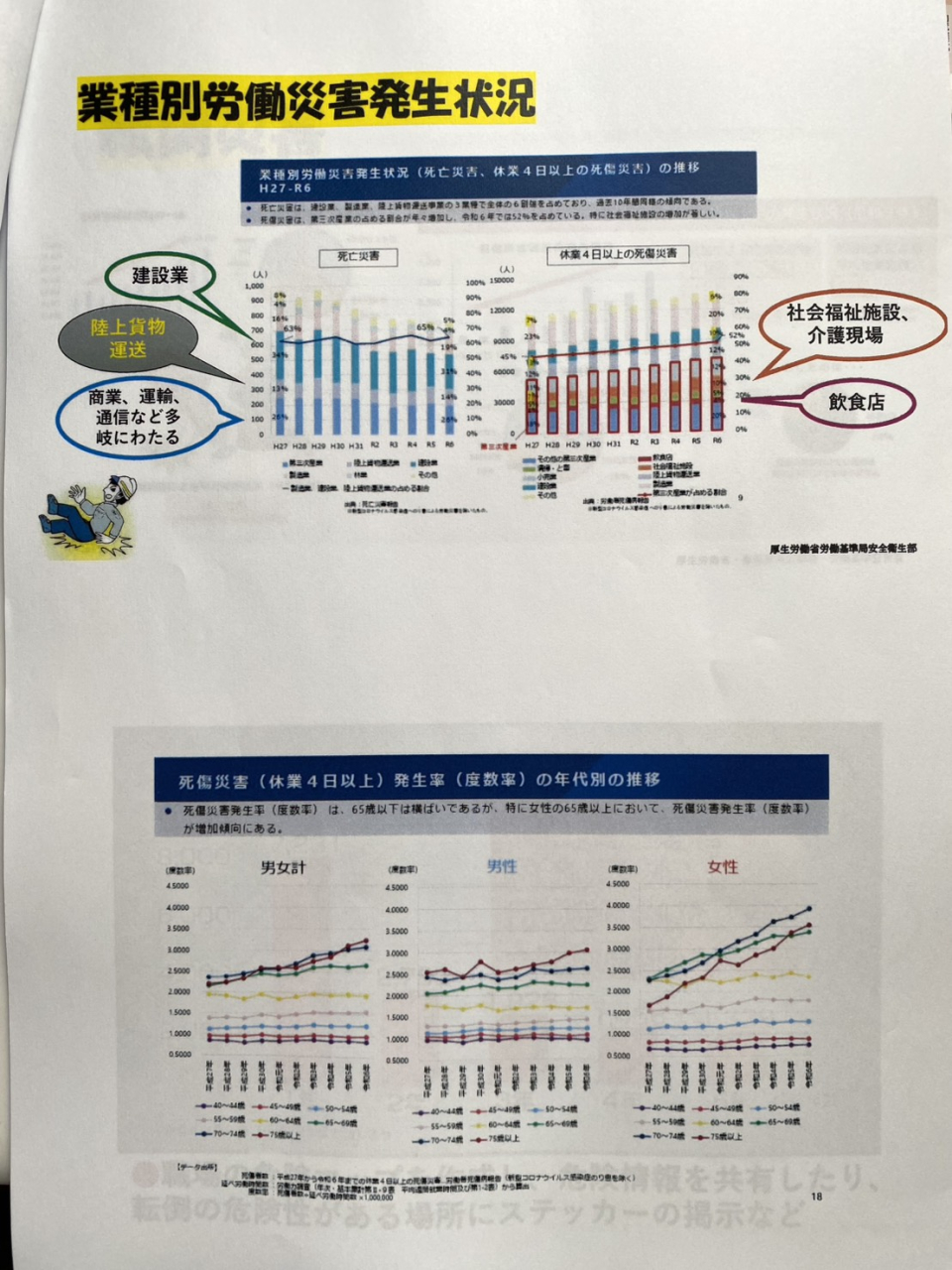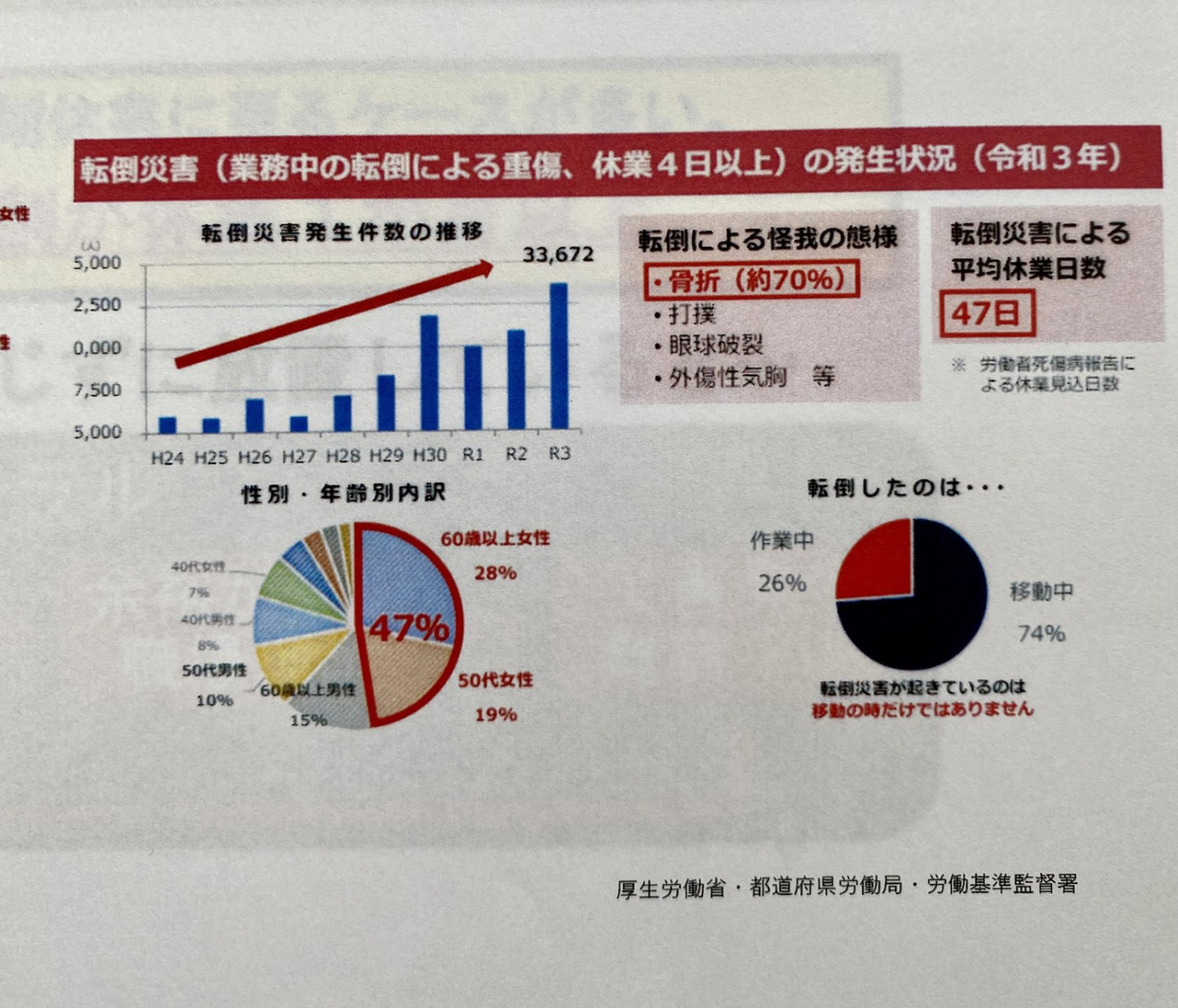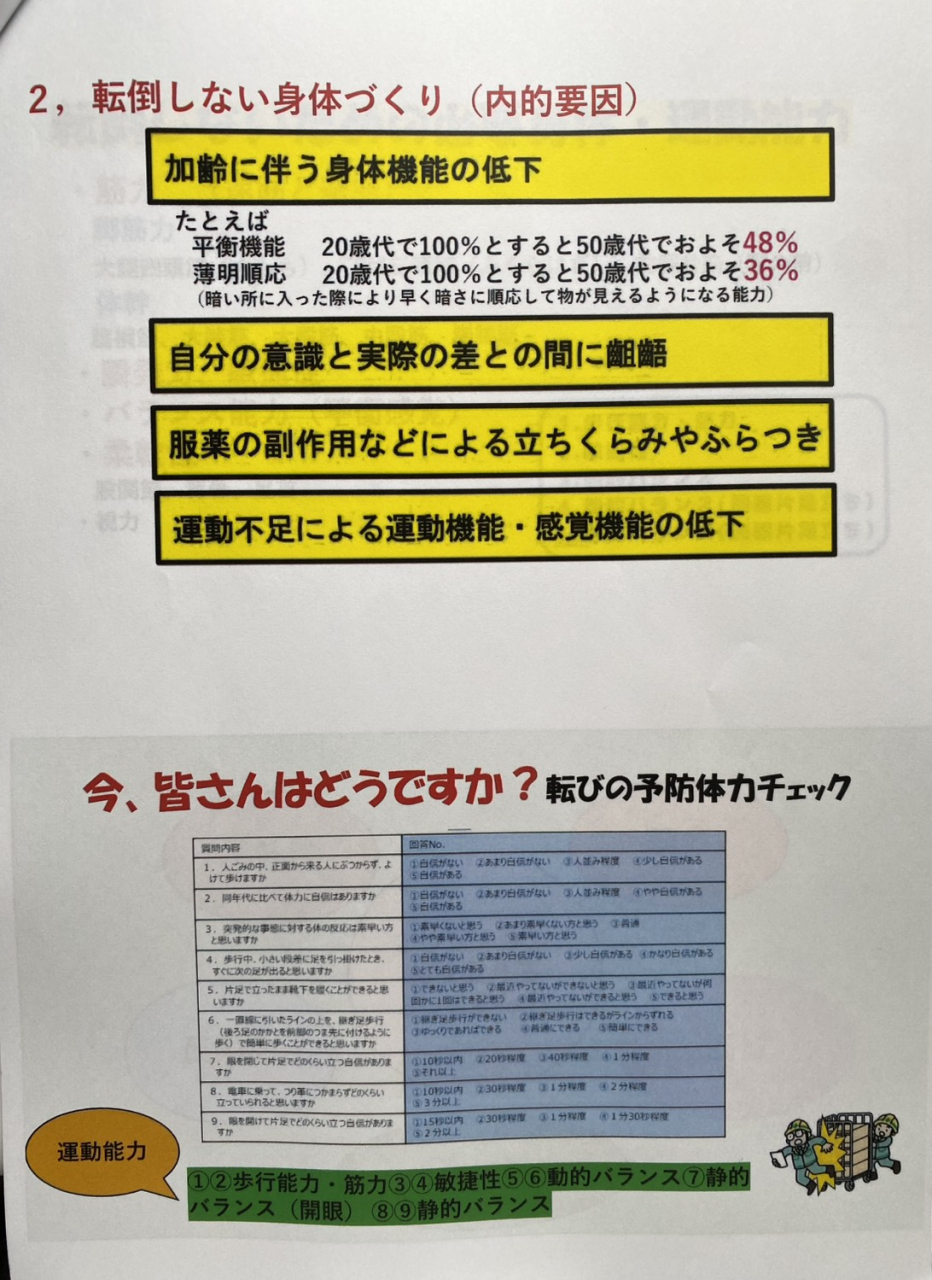 業務中に起きる負傷、疾病。移動中に起きる交通事故、、、労働災害も様々ですが、今回近年急激に増加している転倒事故からの転倒災害について労働災害の現状と転倒の外的要因(転びを防ぐ環境、くつなど)そして、専門である内的要因(転ばない体づくり)について筋力、柔軟性、敏捷性、骨力、バランス力に詳しく触れ、「転倒等リスク評価テスト」も実施し、今の自身の体力に気づき、次の目標に向かっての行動変容のきっかけにして頂きました。